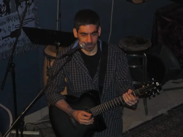 Roo Forrest played a rather creative set with a cello and bongo accompaniment ranging from his serious and masterfully written “Istanbul” to a well performed, albeit unusual, cover of “Fulsom Prison blues” which was accompanied by inserts during instrumental breaks of poems by Anne Frank (Roo’s sublimely unusual). And finally ending his set with an amusing political assessment of our current presidential candidate situation, complete with costumes, props, and subtle but witty gimmicks, fitting into his song an introduction to our highlight and star of the evening Jabi Shriki. On a side note “Istanbul” was requested from the audience, it was the first time I’d heard it and it blew me away. I don’t know if this song is available for listen but you can check out Roo’s debut CD at: http://www.rooforrest.com
