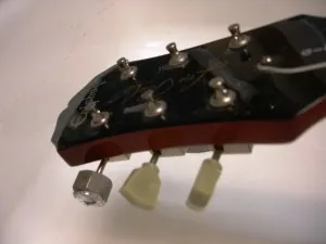 I probably should have checked out some of this information before beginning my own repair efforts. However, I believe very strongly in learning from my mistakes. Hopefully I can help others avoid the same pitfalls. To recap: I’ve decided to replace my standard issue Epiphone Les Paul pickup with a used DiMarzio 159 and have totally wimped out on paying for a new set of tuners, opting to try my luck finding a replacement for the sole missing tuner (oriented to the bass side - Anyone? Anyone?)