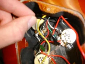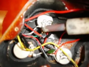 Cracking open the back panel of my guitar with a crowbar (just kidding…but it’s probably a bit believable at this point). I find that things are not as complicated as I had feared. There are two potentiometers (“pot”, from here out) for each pickup and a mass of wires leading off to the bridge selector switch. (This separation of powers, as opposed to those outlined in the U.S. Constitution, appears to be a good thing, as the wiring looks really messy up behind the selector switch panel.)